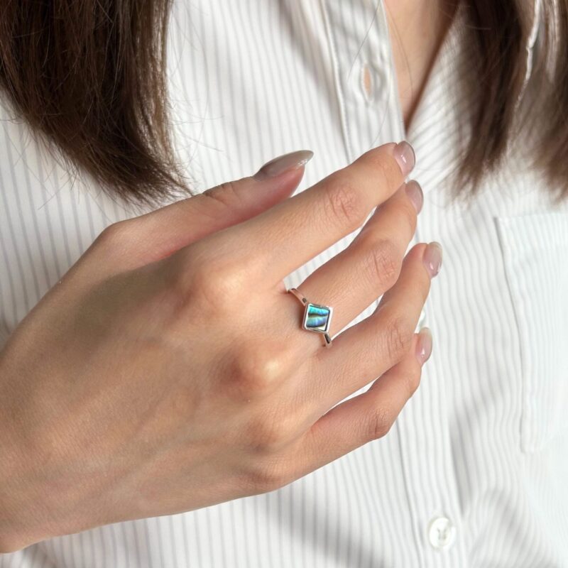 アバロンリングは▢を使い、平面に整えることで、多色性を活かしています。リングの幅を細目に仕上げ、貝を目立たせるデザインとなっています。