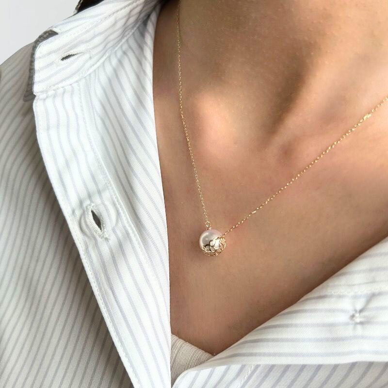このネックレスは、アコヤ真珠の光沢に花柄にカットした薄い地金を合わせることで、シンプルでありながらも個性的な印象を与えてくれます。