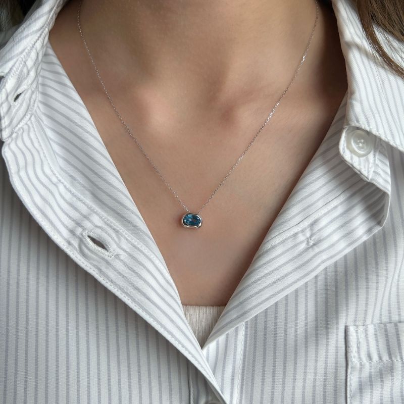 ビーンズ型のトップには、青色が綺麗な11月の誕生石ブルートパーズを。その脇にはダイヤモンドが添えられています。
