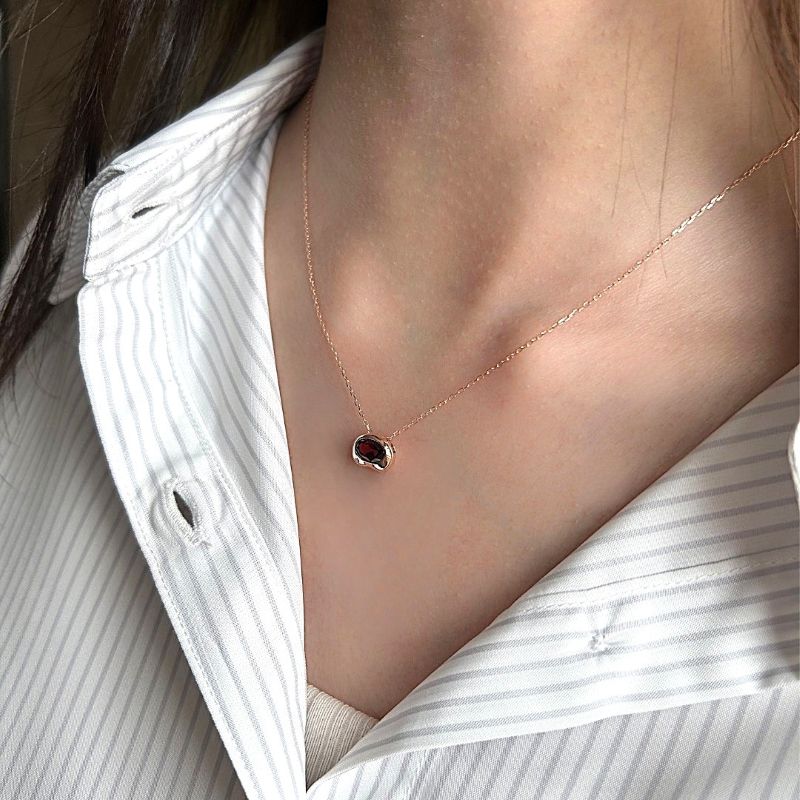 ビーンズ型のトップには、濃い赤色特徴的な1月の誕生石ガーネットを。その脇にはダイヤモンドが添えられています。