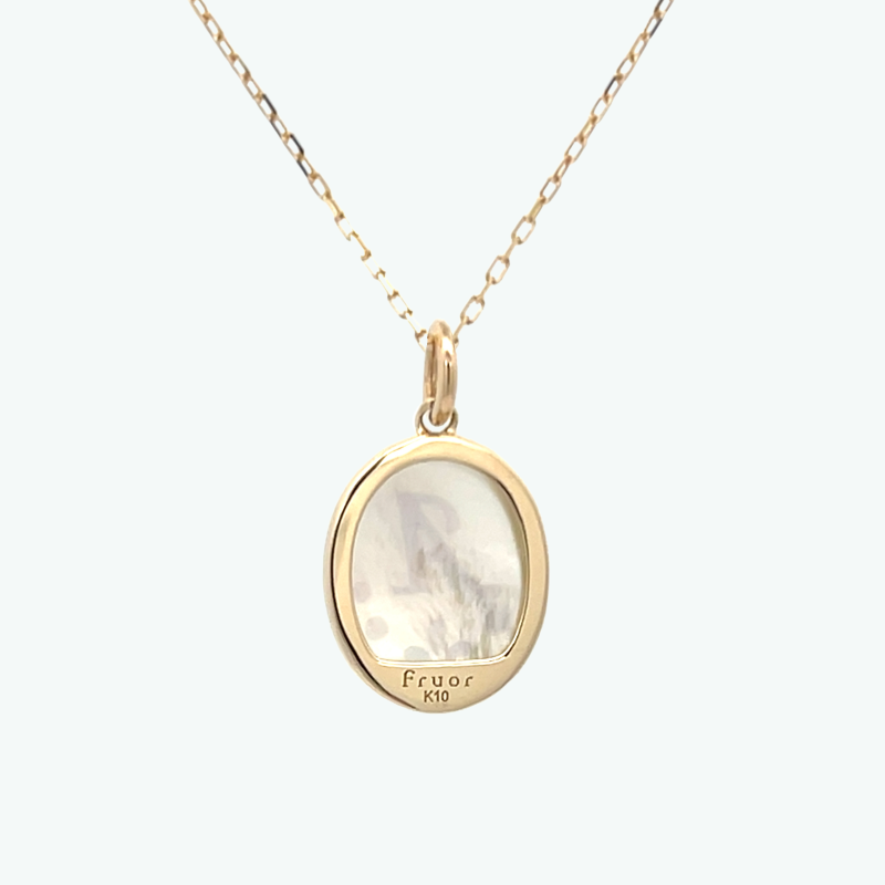象嵌技法とは、異なる素材を組み合わせて模様や装飾を施す伝統的な工芸技法で、白蝶貝にイニシャルとなる地金を象り、嵌め込んで作られています。