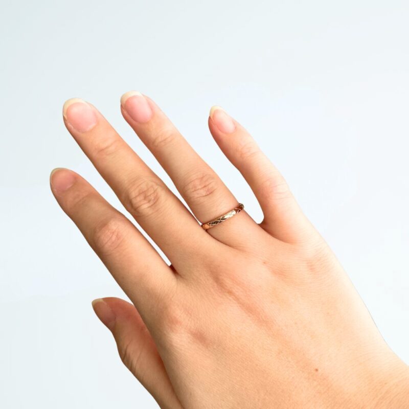見る角度によって表情が変わるデザインは、1本で3パターンの楽しみを与えてくれるとともに、リングの中心がズレてしまう悩みも解決してくれます。