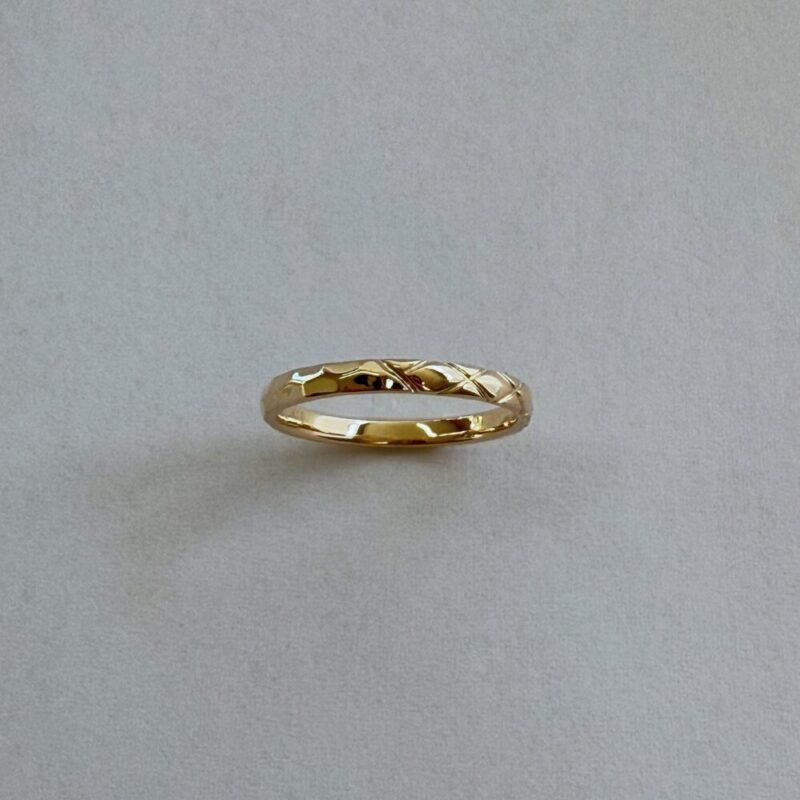 規則正しい断面、ひし形の模様、そしてシンプルな甲丸ラインが、その時々で多面性を映し出します。